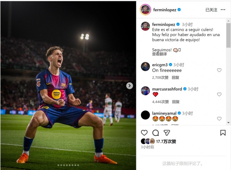 费尔明社媒晒出激情庆祝的照片,配文:“这就是前进的方向!非常高兴能为这场漂亮的团队胜利贡献力量!继续加油!”