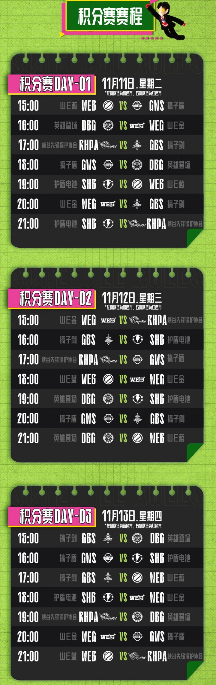 - 积分赛阶段蓝/红方在确保每支队伍6场比赛分别为3场蓝方和3场红方的前提下,由队长随机抽签决定