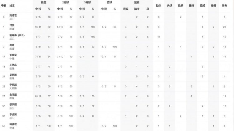 辽宁全运男篮此役6人上双,付豪20分6篮板3助攻,赵继伟15分5篮板11助攻,原帅19分,刘雁宇14分6篮板,余泽辰19分6篮板,鄢手骐12分。