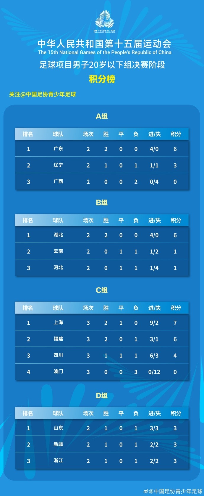 【八强出炉】中华人民共和国第十五届运动会足球项目男子20岁以下组决赛阶段小组赛结束,积分榜和第四、五、六比赛日对阵如下??