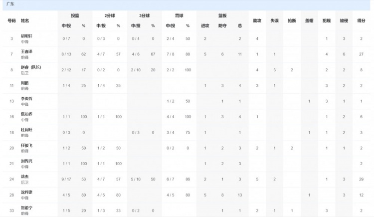 广东队全队12人均有上场得分,徐杰29分3篮板5助攻,王睿泽27分11篮板1助攻,赵睿8分4助攻。