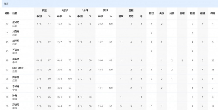 江苏队方面,蒋浩然23分4篮板,郑祺龙14分6篮板5助攻。
