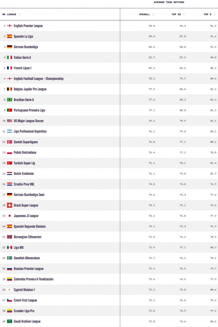 而根据专业数据机构Opta的最新全球联赛实力排名显示,英超是目前实力最顶尖的联赛,其次是西甲、德甲、意甲以及法甲,英冠位居第六。沙特联排名全球第29,落后于德乙、西乙等联赛。