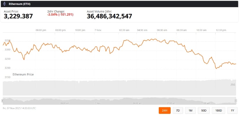 截至发稿,以太坊(ETH)报价3,229美元,24小时跌幅3.04%。来源:Brave New Coin以太坊价格