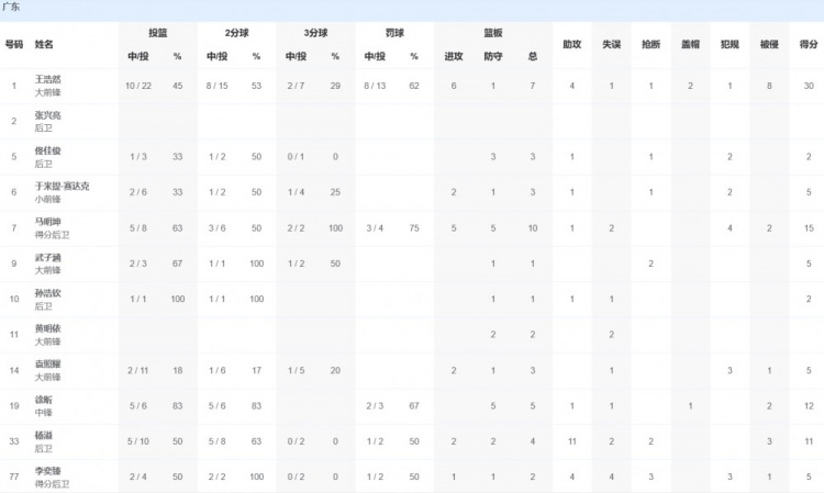 广东队方面,王浩然30分7篮板4助攻1抢断2盖帽,徐昕12分5篮板1助攻1盖帽,杨溢11分4篮板11助攻2抢断。