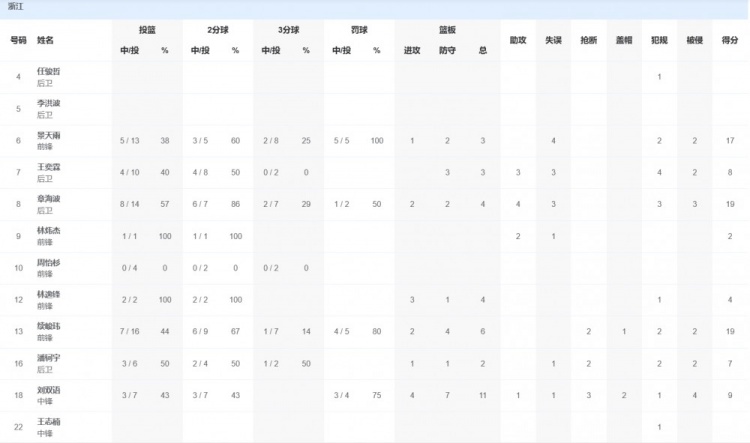 浙江队方面,续峻玮19分6篮板2抢断,章海波19分4篮板4助攻,景天雨17分3篮板。