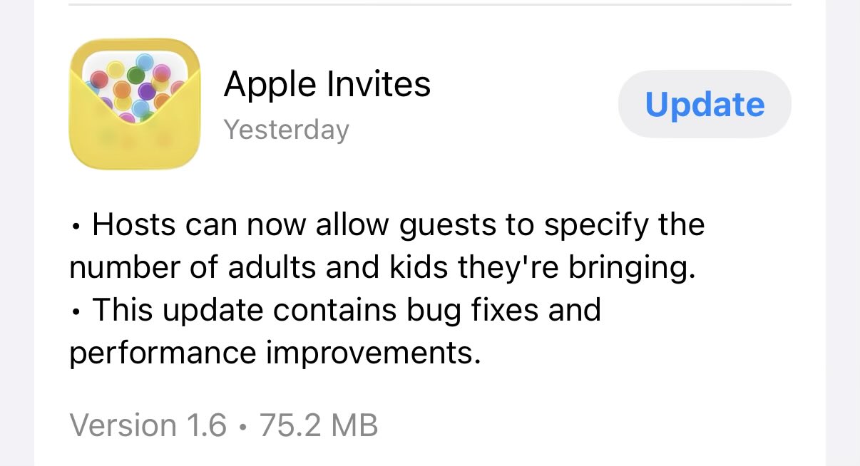 11 月 12 日消息,科技媒体 Appleinsider 昨日(11 月 11 日)发布博文,报道称苹果更新其官方活动管理应用“Apple Invites”至 1.6 版本,现在受邀宾客在回复邀请时,不仅可以确认是否出席,还能详细注明随行团队的具体人数,并明确区分成人与儿童的数量。