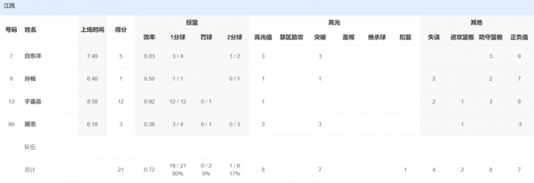 江西队方面,于喜淼12分4篮板,白东洋5分3篮板。
