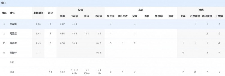 中国澳门队方面,何浩然7分2篮板,许友维4分2篮板。