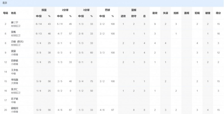 北京队方面,张帆16分1篮板3助攻,廖三宁15分3篮板9助攻3抢断,翟晓川15分8篮板2助攻2抢断。