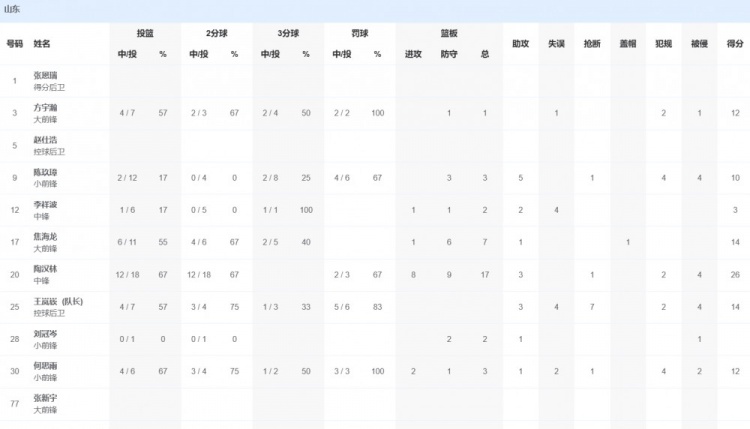 山东队方面,陶汉林26分17篮板3助攻1抢断,王岚嵚14分3助攻7抢断,焦海龙14分7篮板1助攻。