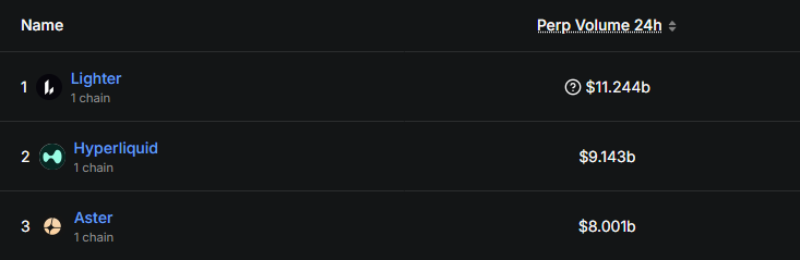 受此消息影响,尚未发币的 Lighter 一时间成为“撸毛党”眼中最值得刷交易量的 Perp DEX 项目。 DefiLlama 数据显示 , Lighter 24 小时交易量突破 110 亿美元,已位居 Perp DEX 首位 ,紧跟其后的是 Hyperliquid(91 亿美元)、Aster(80 亿美元)。