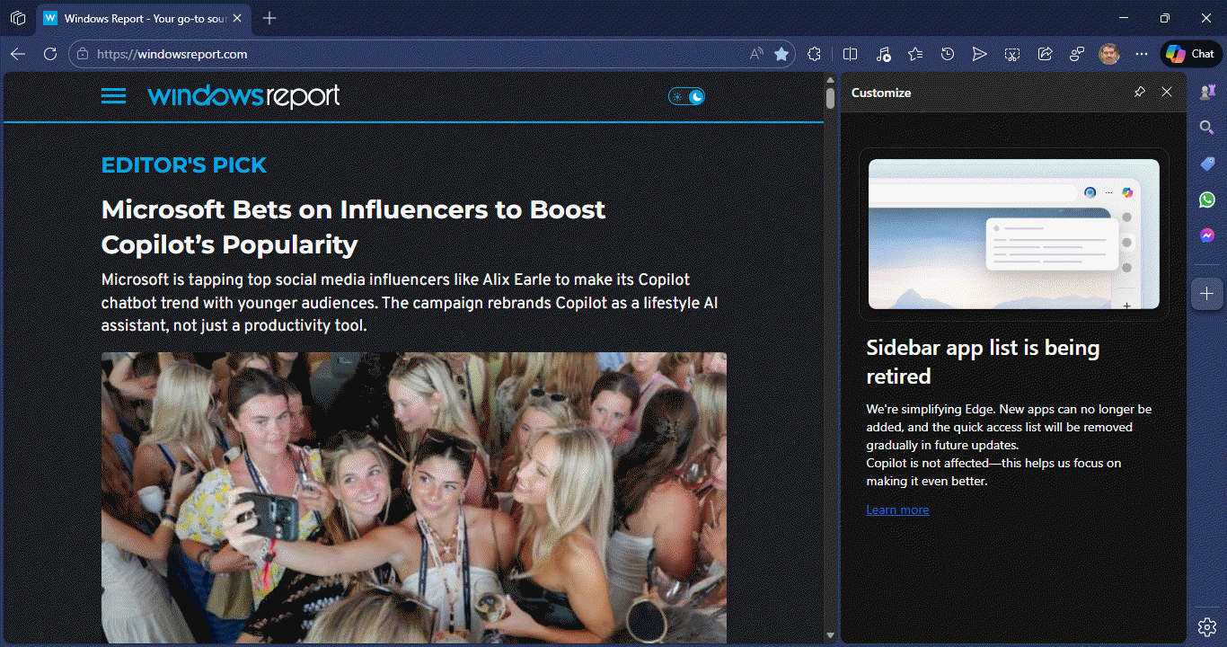11 月 13 日消息,科技媒体 Windows Report 昨日(11 月 12 日)发布博文,报道称在 Canary 频道最新 Edge 浏览器版本中,微软为简化浏览器体验并集中资源优化其 AI 助手 Copilot,确认将逐步淘汰“侧边栏应用列表”(Sidebar App list)功能。