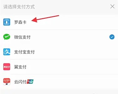 4、从弹出的支付方式列表中,选择”罗森卡“这一项作为本次交易的支付工具。