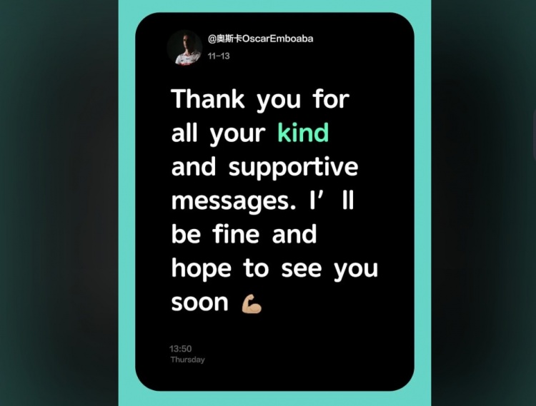 今天,奥斯卡再度在个人社媒报平安,他写道:感谢球迷们发来的祝福与留言。请放心,我没事的,也希望早些见到大家。