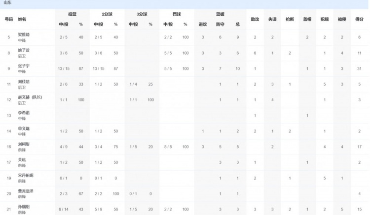 山东队方面,张子宇31分10篮板1助攻,姚子萱11分6篮板6助攻,刘柯彤17分8篮板。