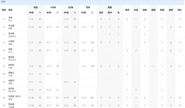 江苏队方面,贺思瑶23分5篮板1助攻5抢断,李沅珊13分2篮板,谢琦睿11分6篮板2助攻。