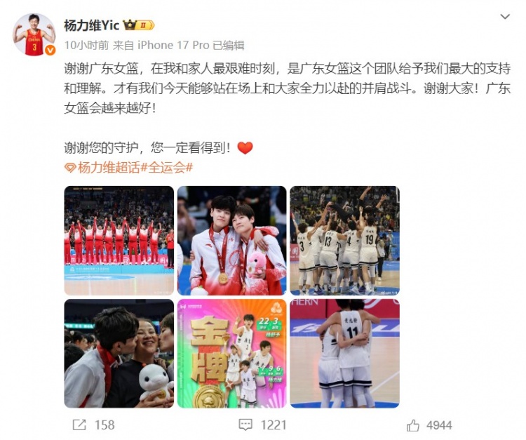 比赛结束后,杨力维在社媒上晒出多张赛后的照片,并在旁边写道:“谢谢广东女篮,在我和家人最艰难时刻,是广东女篮这个团队给予我们最大的支持和理解。才有我们今天能够站在场上和大家全力以赴的并肩战斗。谢谢大家!广东女篮会越来越好!