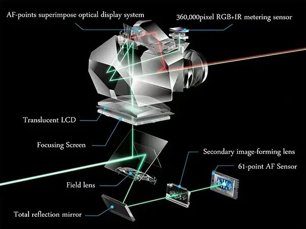 许多老单反上,只有使用 EVF 取景时才能用速度更快的相位对焦,因为这类单位有一个单独的自动对焦模块,位于相机底部(61)。