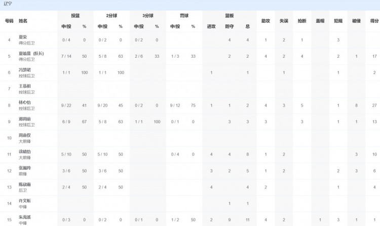 辽宁队方面,林心怡27分2篮板4助攻5抢断,夏瑜蔓17分2篮板4助攻4抢断。