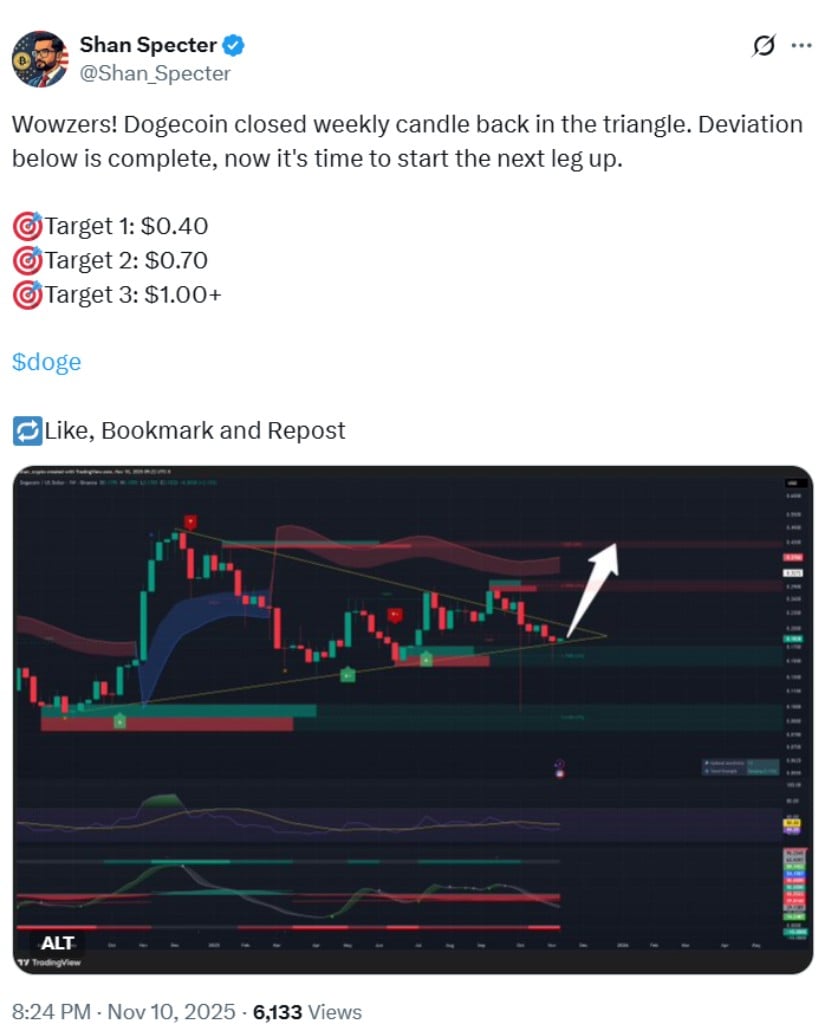 加密图表分析师Shan Specter在近期分析中强调了这一形态,并指出狗狗币的技术结构可能为价格上探关键目标位铺平道路。"狗狗币蓄势待发",Specter表示,若看涨动能持续,价格可能冲击0.40美元、0.70美元甚至突破1.00美元关口。价格短暂下破后重新进入三角形态,增强了图表分析师的乐观情绪,表明多头可能正在该区间重掌主动权。