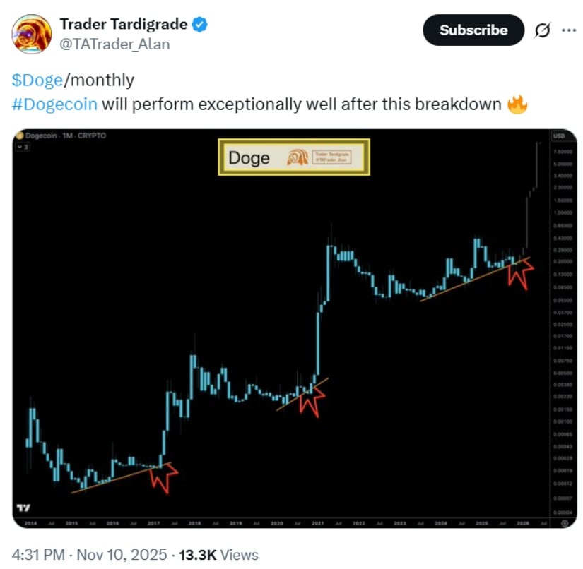 "从月线框架看,狗狗币在本次下破后似乎准备启动强劲上涨。" 来源:@TATrader_Alan via X