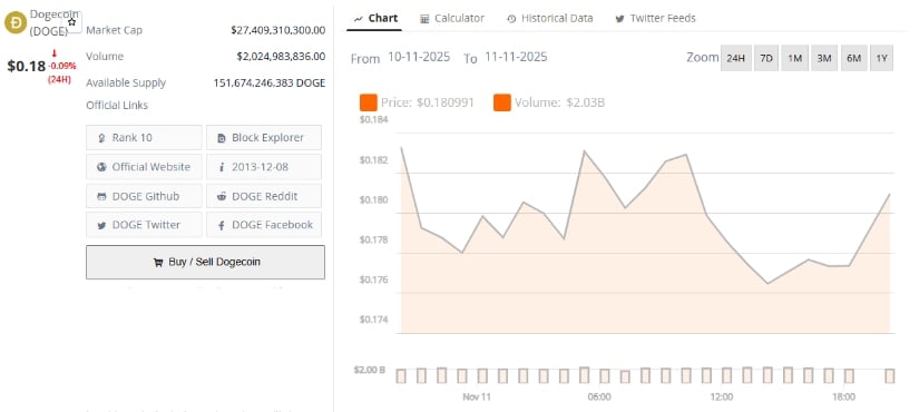 狗狗币现报约0.18美元,24小时微跌0.09%。来源:Brave New Coin