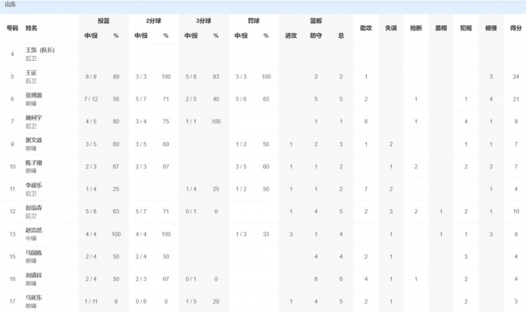 山东队方面,张博源21分5篮板2助攻1抢断,王证24分2篮板1助攻,彭泓森10分5篮板2助攻。
