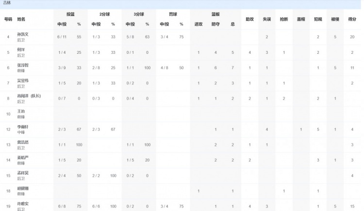 吉林队方面,孙凯文20分,张淳智11分7篮板1助攻。