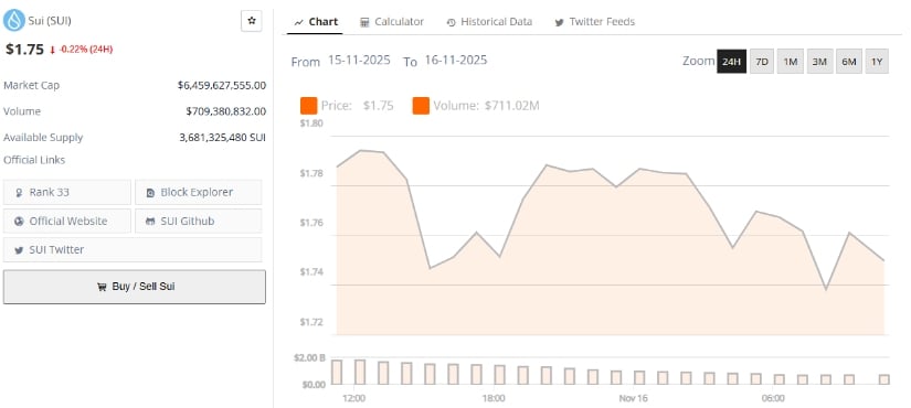 Sui现报1.75美元,24小时微跌0.22%。来源:Brave New Coin