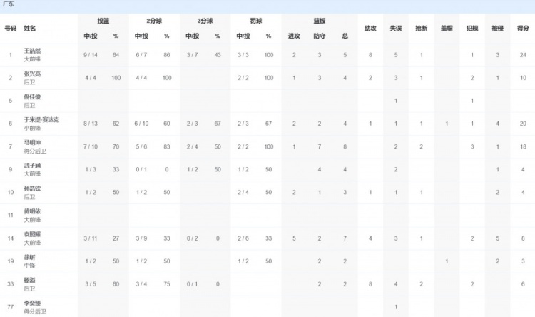 广东队方面,王浩然24分5篮板8助攻1抢断,于米提20分4篮板1助攻1抢断,马明坤18分8篮板2抢断,张兴亮10分4篮板2助攻。