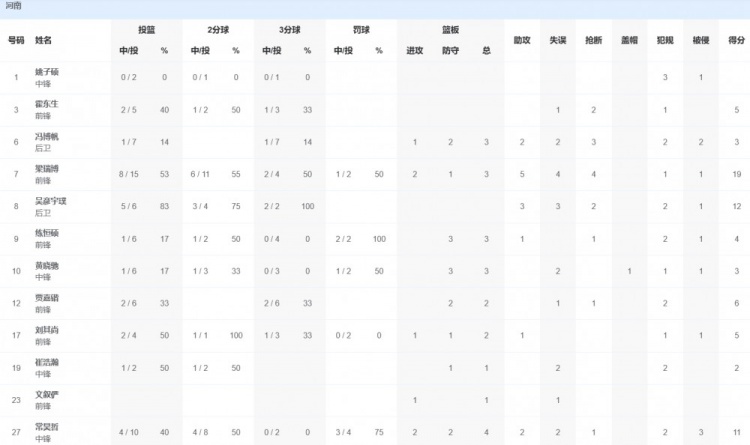 河南队方面,梁瑞博19分3篮板5助攻,吴彦宇璞12分3助攻2抢断。