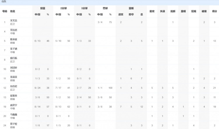 山东队方面,段昂君21分5篮板5助攻5抢断,曲笑宇19分12篮板1助攻4抢断1盖帽,陈家政13分5篮板1助攻3抢断。