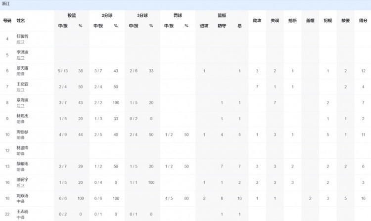 浙江队方面,刘双语16分10篮板1助攻,景天雨12分1篮板3助攻,周怡杉11分5篮板1助攻。