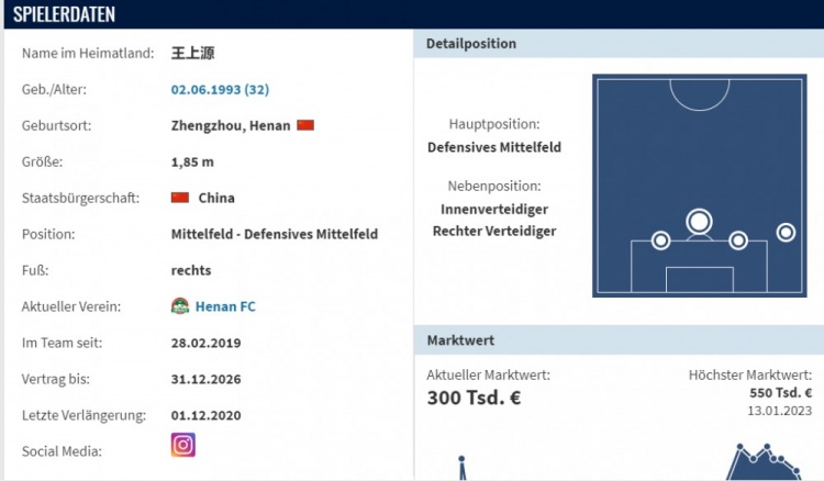 本赛季,王上源代表河南队出战31场,其中29次首发,贡献了1个进球和5次助攻。