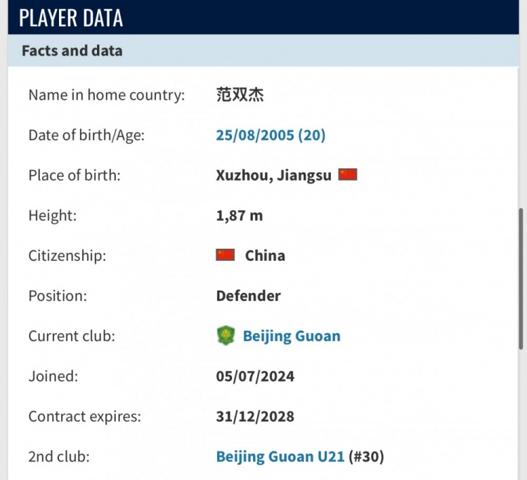 直播吧11月18日讯 根据德国转会市场网站的消息,国安俱乐部已与范双杰续约两年,合同有效期至2028年12月31日。