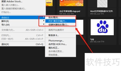 我们可以通过使用图像处理软件如Photoshop(简称PS)将JPG图片转换成PDF格式。首先,启动PS并选择“文件”菜单,然后从下拉列表中挑选“自动功能”。最后,在自动选项中选择PDF演示文稿即可完成转换过程。
