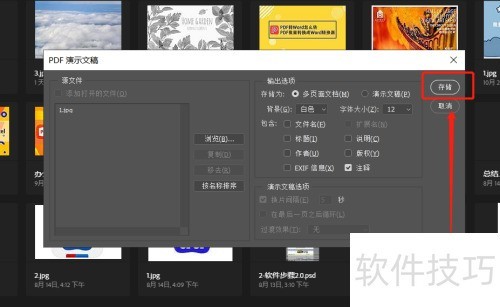 当你准备好了一篇PDF演示文稿,并需要将其中的图片上传和整理起来时,记得打开选择后界面。在此处,你可以将图片添加到您的演示文稿中并设置保存选项。最后,点击“保存”按钮即可完成操作。值得注意的是,这种方法不支持将多张图片合并为一个PDF文件。