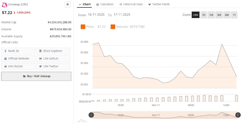 据BraveNewCoin数据,UNI现报7.22美元附近,24小时跌幅1.03%。报告市值达4,554,045,288美元,成交量为879,834,989美元。流通供应量为629,892,750枚代币,按市值排名全球第36位。