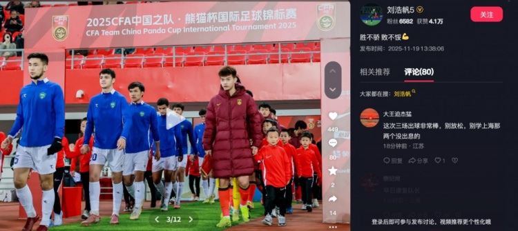 2025年熊猫杯落下帷幕,U22国足1胜1平1负获得亚军,作为球队队长,刘浩帆三场比赛全部首发且打满270分钟。今天,刘浩帆发文总结熊猫杯,他写道:胜不骄 败不馁。