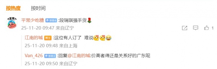 有网友在评论中表示:“段睿骐抢手货。”对此@江南的城 回复:“这位有人订了 。难说。”