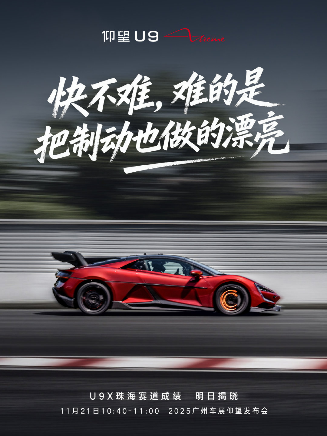 11 月 20 日消息,比亚迪旗下仰望汽车今日宣布,仰望 U9Xtreme 将在明天开幕的 2025 广州车展上首次公开亮相,同时揭晓上海・成都・珠海・株洲 四大专业赛道成绩。官方的预热文案中,更是出现了#仰望 U9X 刷新全国赛道纪录#的标签。