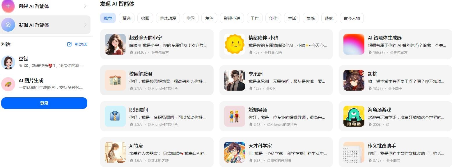 目前,豆包已推出多个特色角色,例如“超爱聊天的小宁”、“英语学习助手”以及“全能写作助手”,满足不同场景下的需求。
