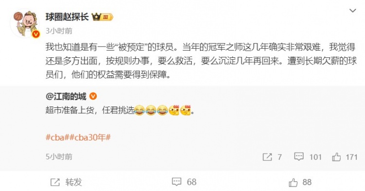 @球圈赵探长 在社媒上转发了这条动态,并在旁边写道:“我也知道是有一些‘被预定’的球员。当年的冠军之师这几年确实非常艰难,我觉得还是多方出面,按规则办事,要么救活,要么沉淀几年再回来。遭到长期欠薪的球员们,他们的权益需要得到保障。”
