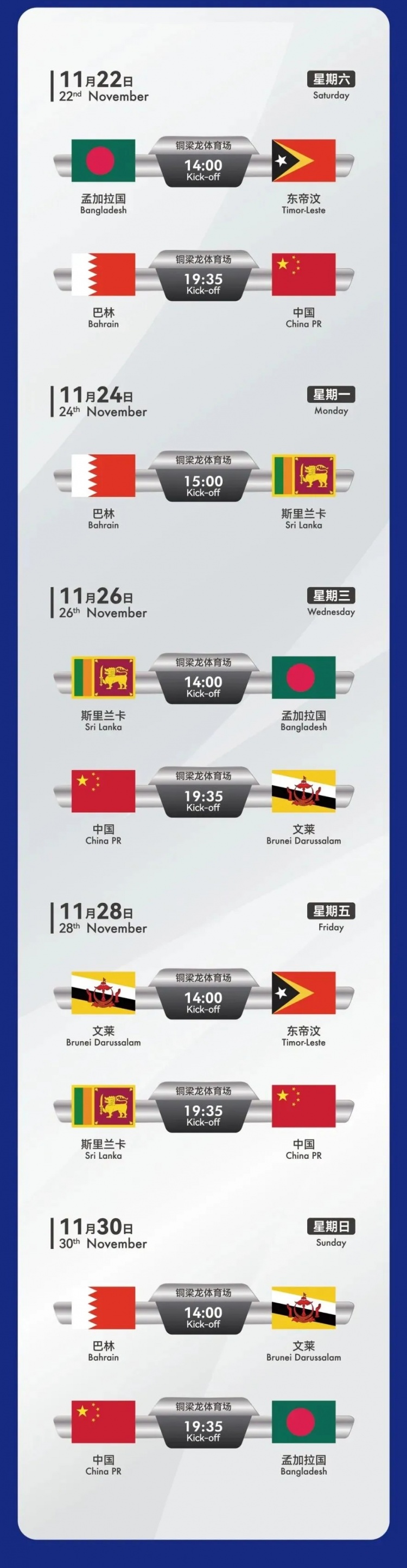 直播吧11月20日讯 国足U16将在11月22日-30日坐镇铜梁龙体育场,迎战与巴林、东帝汶、文莱、斯里兰卡和孟加拉国同组,小组头名将直接晋级U17亚洲杯决赛圈。