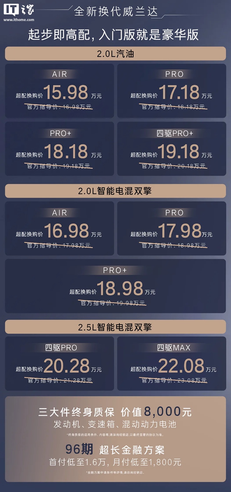 广汽丰田全新换代威兰达官方指导价 16.98 万元起,超配换购价 15.98 万元起。附具体价格如下: