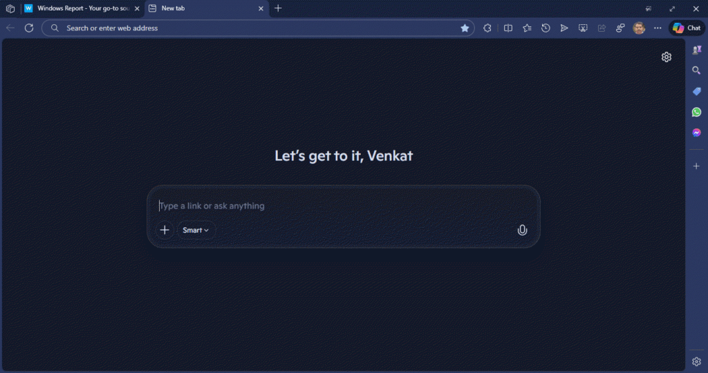 据了解,在“Team(Surface Hub)”模式下,新标签页界面变为居中布局:中央呈现欢迎语,叠加一个悬浮搜索框,并附带“智能”(Smart)下拉菜单,此设计适用于共享设备或会议协作场景。而在 HoloLens 模式中,Edge 则采用更为简洁的界面,仅保留一个基础搜索栏以及一个 Copilot Discover(Copilot 探索)开关。
