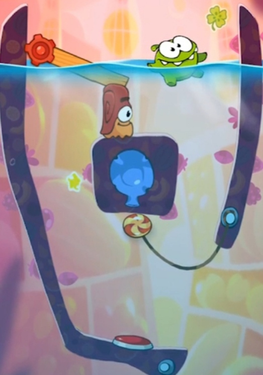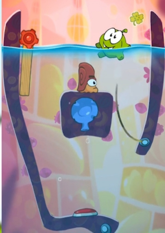 3、点击蜗牛,让糖果吃到第三颗星星,并且让上面的动物吃到糖果。