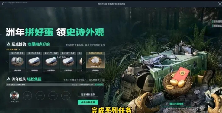 活动就在进入游戏界面,点击全面战场,然后右上角有个“摸鸟蛋”活动,获取联动皮的门槛,你首先要参加“摸鸟蛋”活动,组队获得周年庆邀请函,还没有邀请函的,兄弟们可以互相组队。