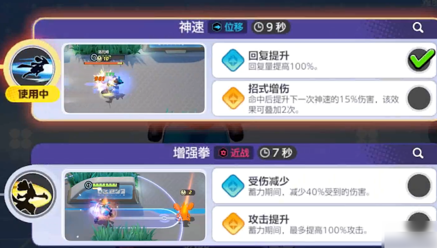 路卡利欧拥有独特的技能,其第一个技能能够迅速接近敌人并对其进行强有力的打击。随着技能等级的升级,玩家可以选择将这个技能替换为增强拳或神速。增强拳需要蓄力,在蓄力期间,角色的移动速度会下降但攻击力会提升。蓄力结束后,角色可以先朝着特定方向突击,并对敌人造成伤害的同时降低自身移动速度。